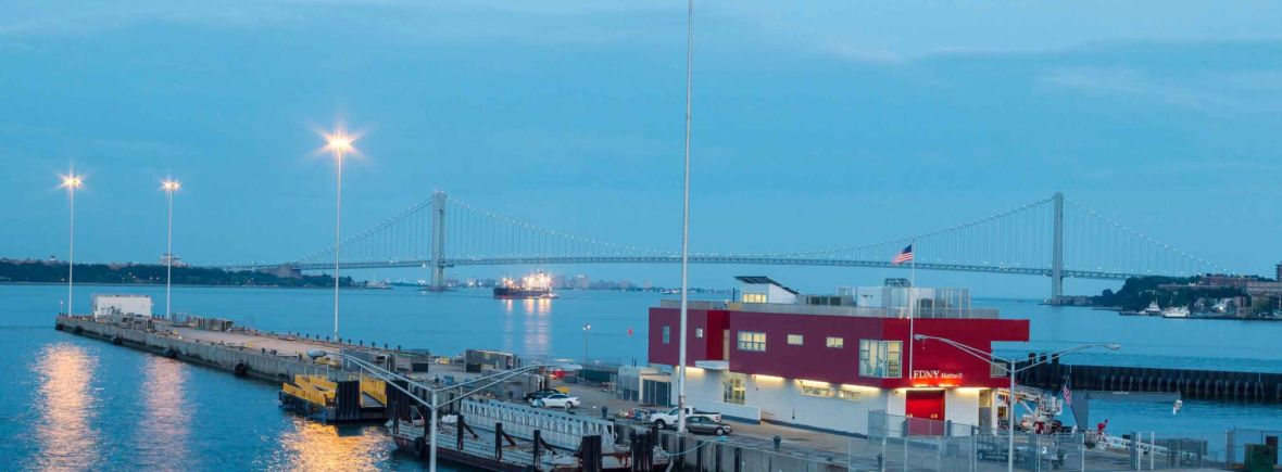 The City of New York Fire Department’s glossy Marine Company 9 firehouse sits at the base of a concrete pier jutting from the northeastern side of Staten Island into the murky waves of New York Harbor. When Sage and Coombe Architects designed the new structure, they didn’t envision its door opening onto a foot and a half of water, the firefighters cut off from dry land and in danger of being pummeled by the 500-ton, state-of-the-art fireboat moored near the building’s side. But in the early hours of October 30, mere months after its opening, Hurricane Sandy threatened to transform the company’s greatest asset into a treacherous liability.